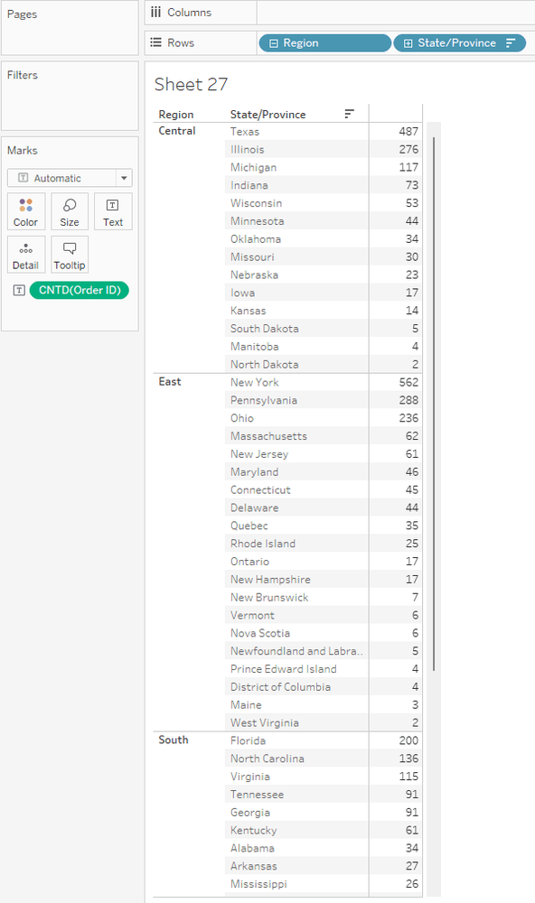 The data source in this blog is from Sample-Superstore in Tableau. Assume that I would like to rank the number of orders from customers in each Region. I will set it up in Tableau and sort the count of orders descending (Image 1):
