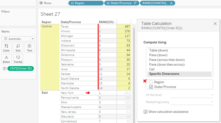 I would like to rank the number of orders from customers by State in each region. Region is higher level than the State/ Province level. In the Specific Dimensions option, I uncheck Region and only keep State/Province. In verbal, I could say: "Calculate the rank of the order number by State/ Province group by Region" or "Ranking the order number by State and restart by region". Now, the result is what I want.