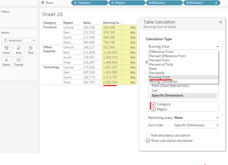 Then, the Table Calculation table will pop up. There are many types to choose in the Calculation Type (Difference from, Percent Difference From, Running Total, ...). I chose Running Total to summarize the sum of sales in the whole column of Sales. Now, I got the total Sales in the last line which is 2,326,534 (Image 6).