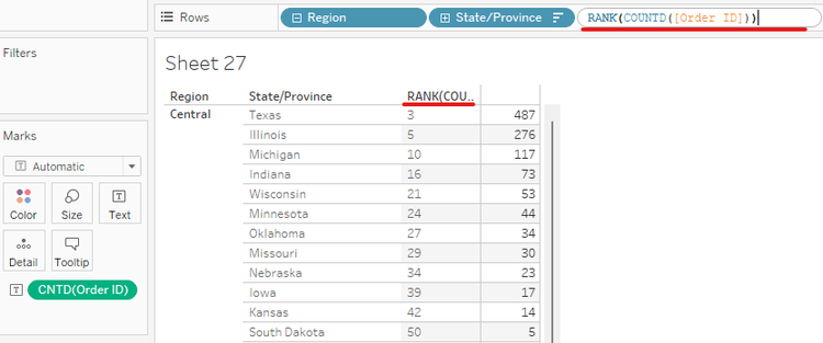 Then, I will put in the Rows as RANK(COUNTD([Order ID])) to compute the rank of the state in each region (Image 2). Then, right-click on that calculation and change it to Discrete. There is a new column for ranking the number of orders. However, the number of ranks is not what I want. Therefore, I need to use the Table Calculation in this case.