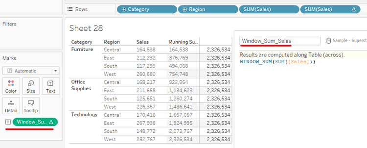 I created a new Calculated Field with the name Window_Sum_Sales. I type the function WINDOW_SUM(SUM([Sales])) to get the total Sum of sales. Then, I drag the Window_Sum_Sales field into Text in Marks. I got a new column. At this time, every row has the total sum of sales (Image 7).