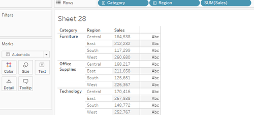 In this example, I create another table by calculating the sum of sales for each category in each region. I drag Category, and Region to Rows and drag Sales to Rows (Change to Discrete) (Image 4).
