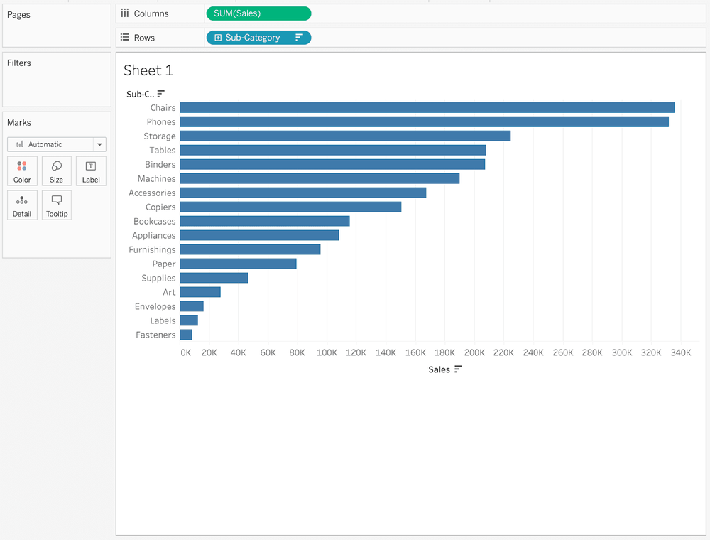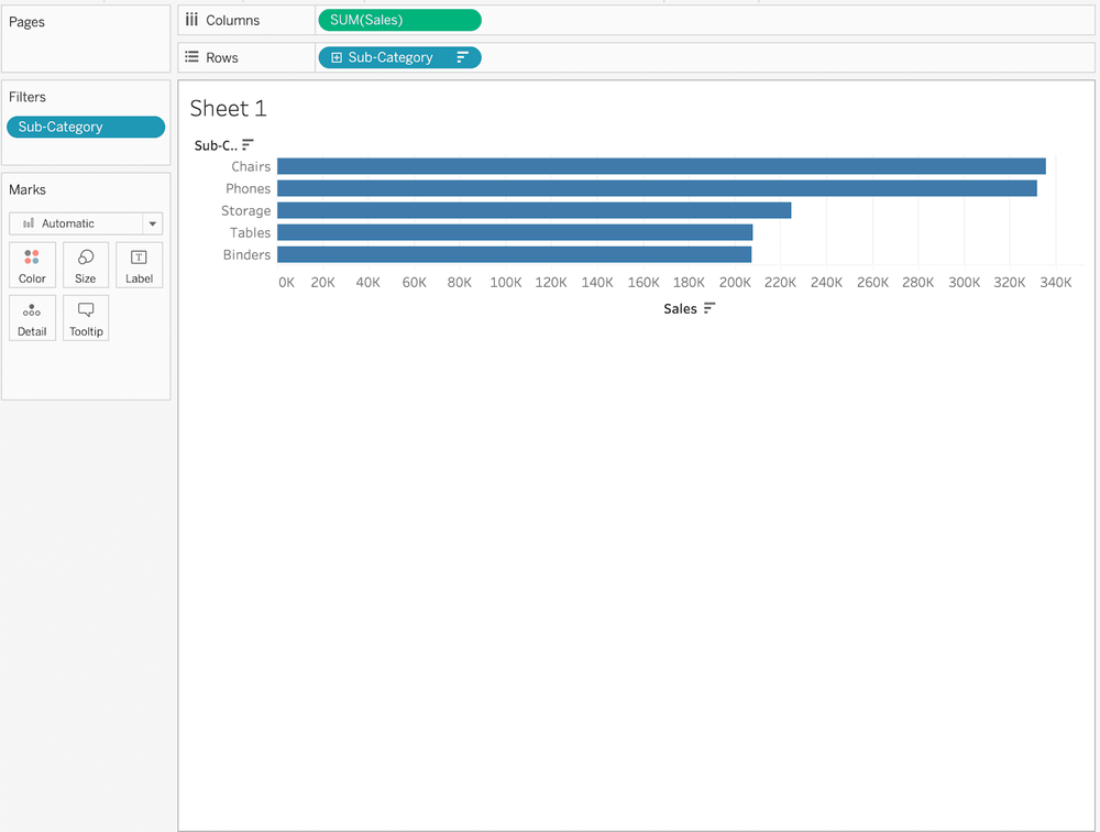 1. Using the Sample - Superstore data source I created the initial view below. The view shows the sales for all sub-categories, sorted with the highest sales at the top.