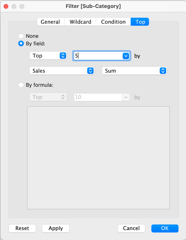 This filter is created by dragging the Sub-Category field to the Filters shelf. In the Filter dialog box, I selected the Top tab and modified the filter so that it states top 5 by Sum of Sales.