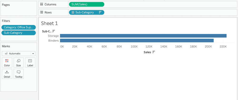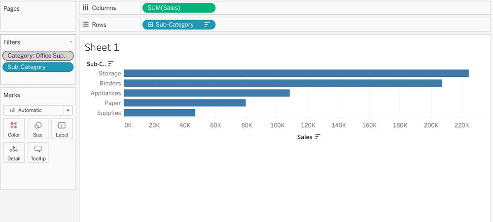 This filtered the view however it only shows 2 Sub-Category products instead of the intended 5. Tableau is behaving in this way because by default each filter is applied separately and the view shows the intersection of each filter applied. Simply put, the view shows that 2 of the top 5 overall products are Office Supplies products.