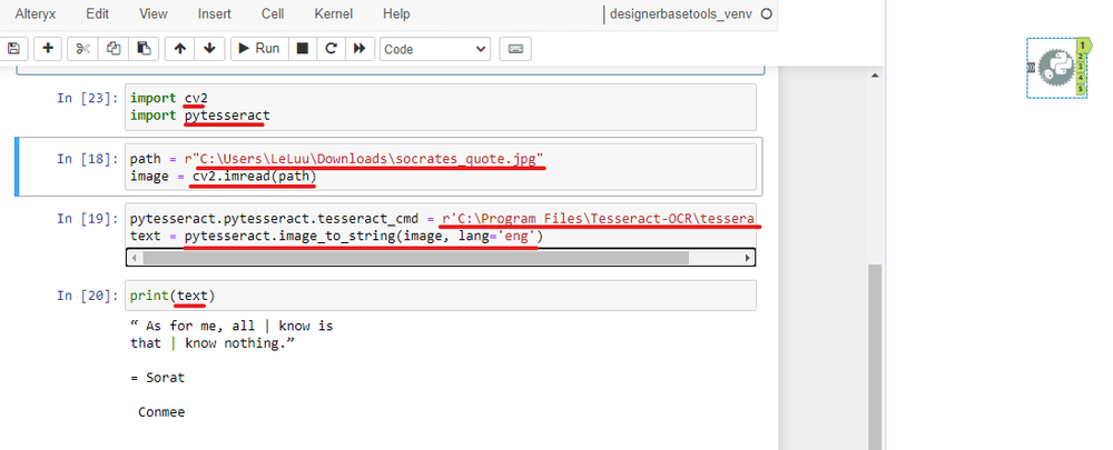 Click on the Python tool, in the Configuration window, Alteryx will load the Jupyter Notebook. Start running the first 2 cells by holding Shift + Enter. Then, install the Pytesseract package by typing: