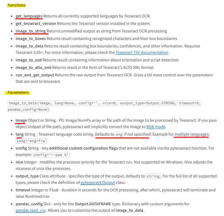 1/ Github Tesseract Documentation Link: https://github.com/tesseract-ocr/tesseract?tab=readme-ov-file#installing-tesseract 2/ Pytesseract Documentation on Pypi.org: https://pypi.org/project/pytesseract/