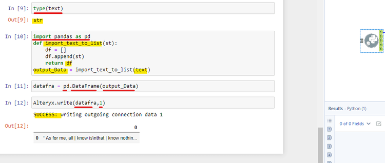 First of all, I check the data type of the text variable that I just stored the data from the image by using the type function. To use the Pandas library, I need to import the Pandas library (Pandas is already installed in the Python tool in Alteryx, so no need to install Package).