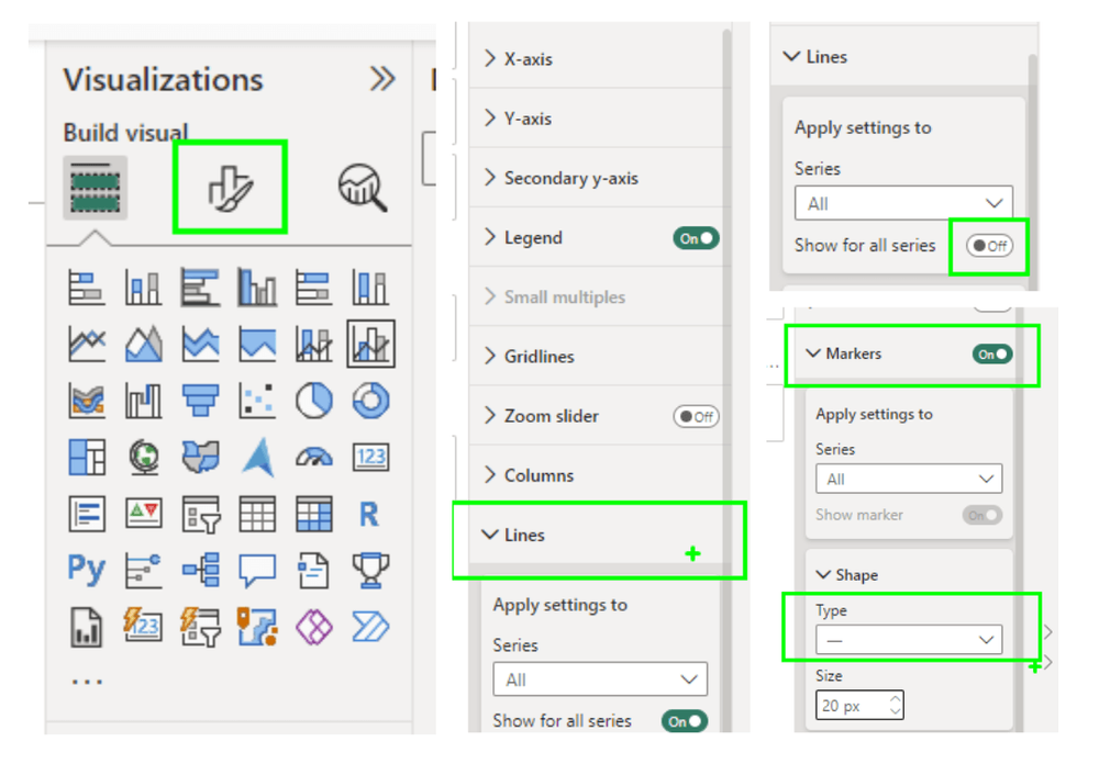 In the visualization pane, select the format button and open the dropdown menu for lines.