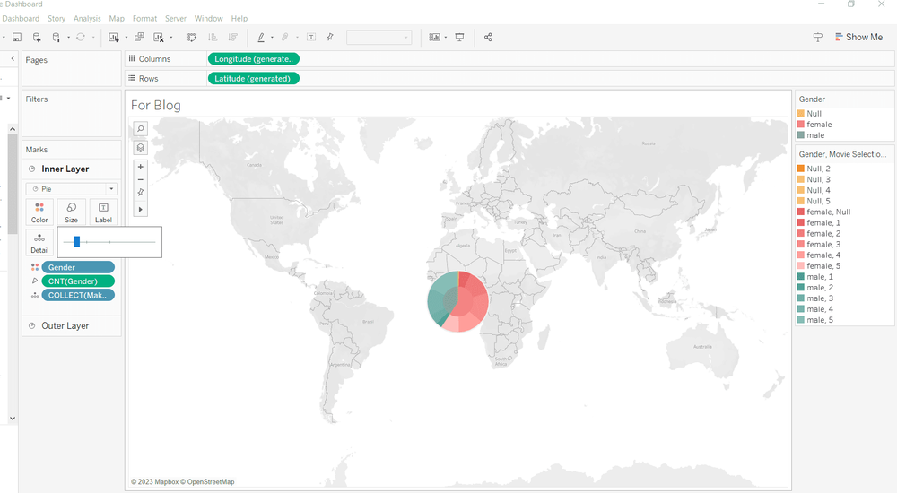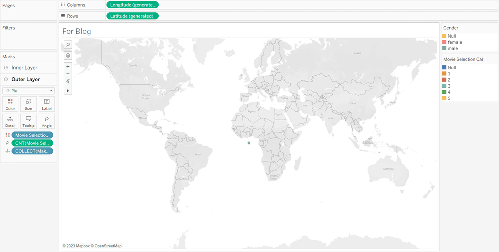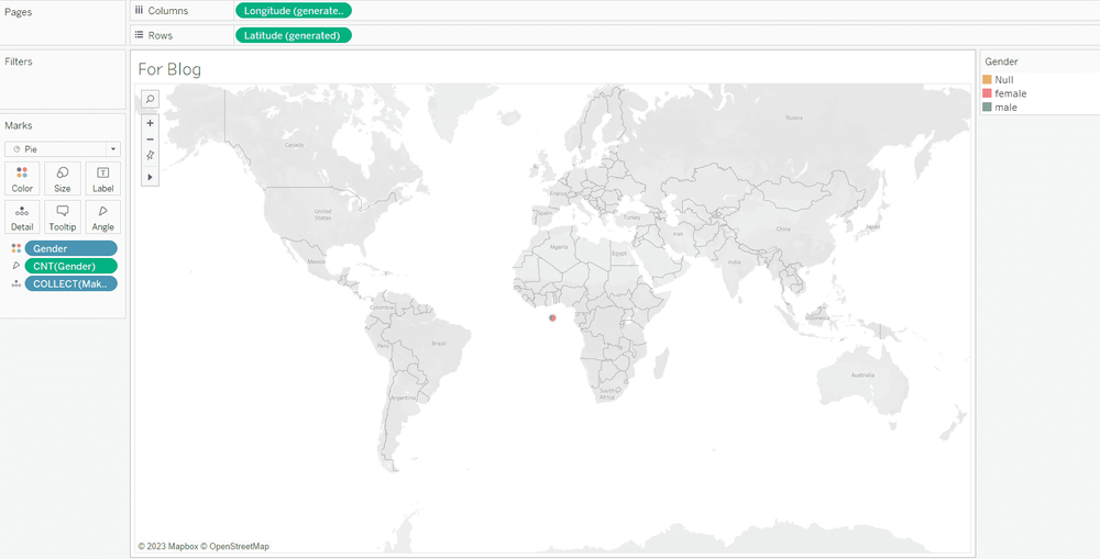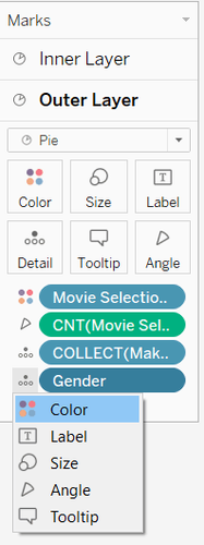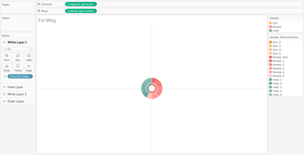 A sunburst has an inner layer and then is broken down into smaller parts as it grows out. To build the inner layer the mark type needs to be switched to pie. Then build out your pie. The example below shows gender in color and count of gender in the angle. The pie will be very small but we will adjust this later on.