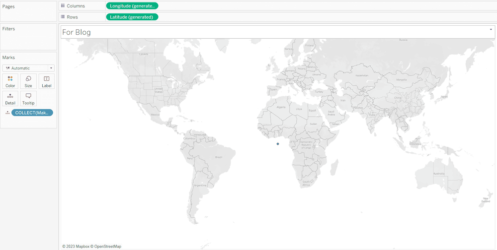 The first step is to create a point, this will allow you to access map layers in Tableau. Makepoint returns a spatial object constructed from a given latitude and longitude. Since this will only be used to build our sunburst, I set the lat and long to (0,0). The calculation should look like this: