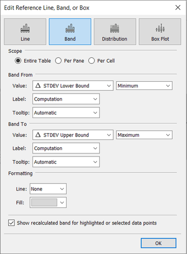 Now that the parameter and calculations have been created we can step into the analytics pane to create our dynamic standard deviation band. In the analytics pane select 'Reference Band' under Custom. All that is left to do is set our band values.