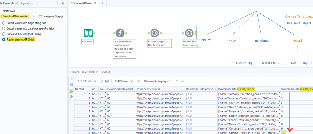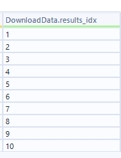 From the tree diagram, in the results array, there are 10 nested objects. In the Results window in Fig. 10, there are 2 columns for results. The DownloadData.results_flatten will store 10 nested objects from the results array. The DownloadData.results_idx will store the index of each nested object after flattening sorted by ascending.