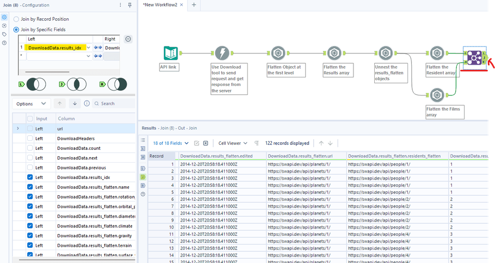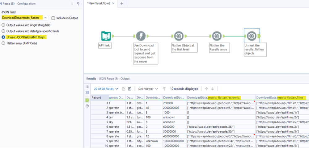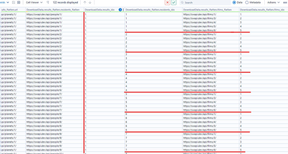 After unnesting the DownloadData.results_flatten field, I got some new columns which are keys of the nested object in the result array. From the tree diagram, you notice that we have 2 nested arrays (residents and films). In the result window, you also see the leftmost mark value of those columns is a square bracket "[".