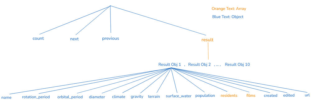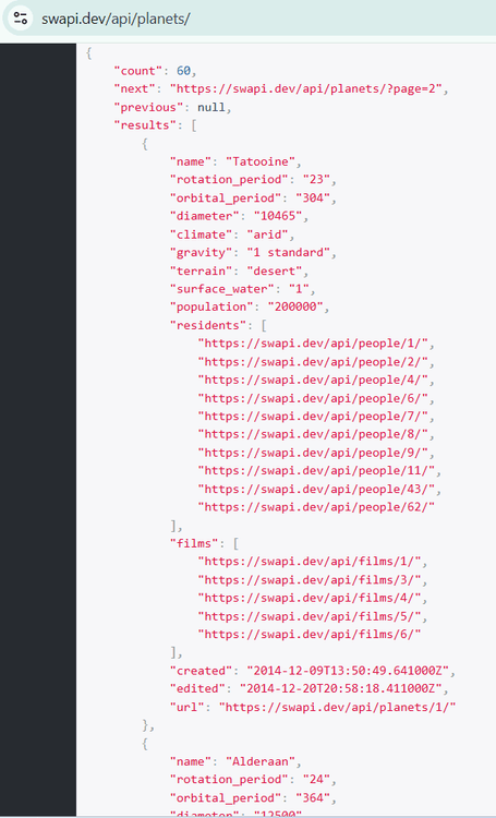 The API I use is from the Star Wars API (SWAPI). You can read the API documentation page here. The API link that I use is: https://swapi.dev/api/planets/
