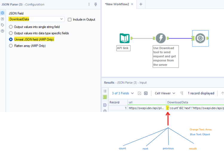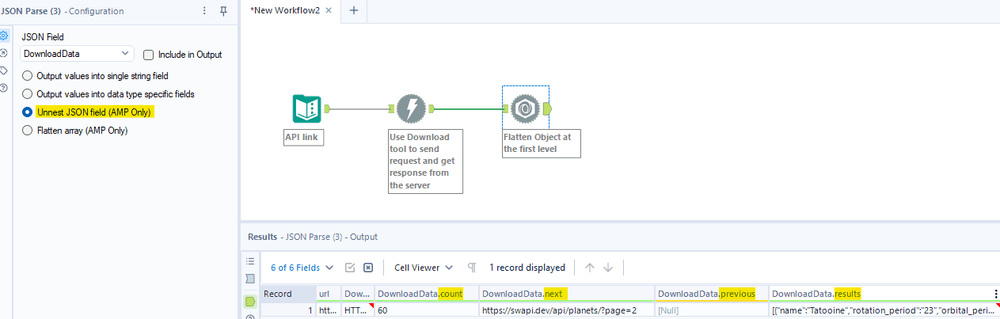 If you notice the value in the DownloadData.results_flatten, the leftmost mark is a curly brace "{" which is an object. From here, you can use the Unnest JSON field (AMP Only) option from another JSON Parse tool to unnest the object (Fig. 11a).