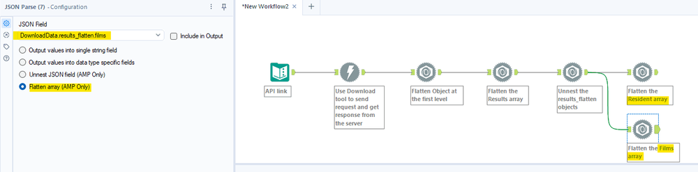 I connect a new JSON Parse tool to connect to the previous JSON Parse tool. In the Configuration window, at the JSON field, I selected DownloadData.results and chose the option Flatten Array (AMP Only) as I wanted to flatten the Results array.