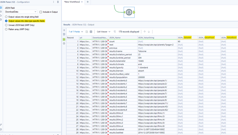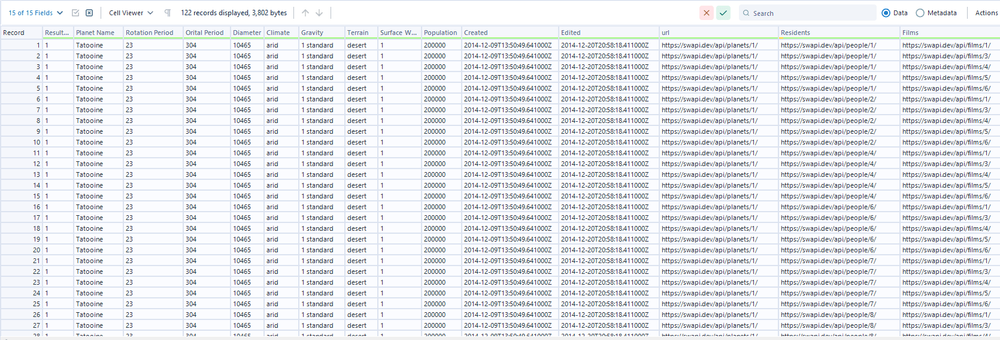 If your request to the server succeeds, you will get the response in the Result window. The code in DownloadHeaders will be 200 OK. Your retrieved data will be in the Download Data column. If you use the Browse tool to connect to the output of the Download tool, you will see the JSON structure as Fig. 3 above.