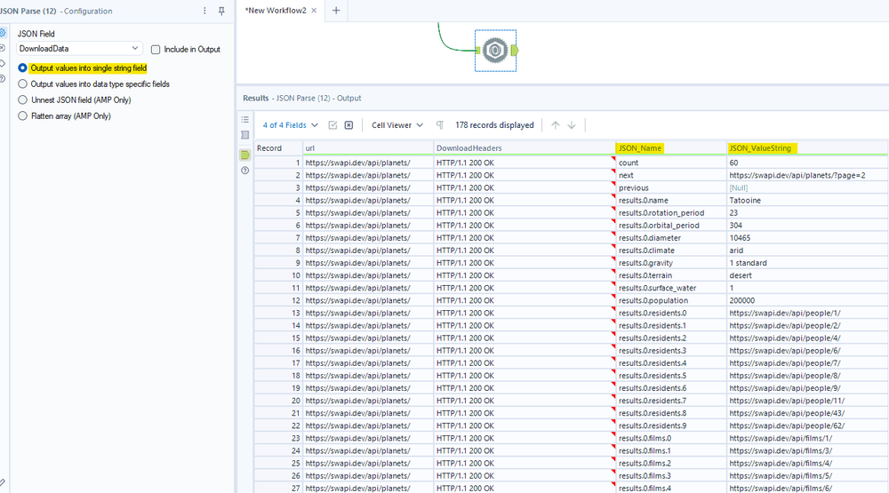 Extracting data by web-scraping data from web pages and retrieving data from API are my favorite topics. In this latest version, Alteryx Designer updated some helpful features in the JSON Parse tool. Those new features save so much time when I need to parse JSON after retrieving data from API, flatten nested objects, and arrays without typing any lines of code. In this blog, I will walk through:
