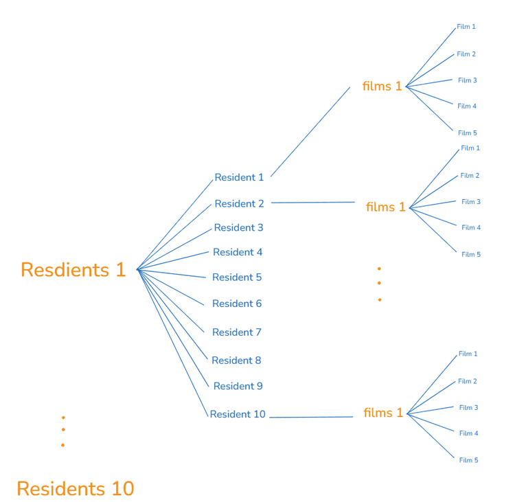 The number of rows if I do that = 10 Residents total 10 residents for each big Resident 10 films array for each resident value * 5 films for each film array = 5000 rows.