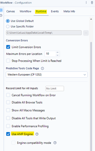 Next, I drag and drop the JSON Parse tool (also from the Developer palette) to connect to the output anchor of the Download tool. Some options in the JSON Parse Tool require running with AMP. By default, Alteryx Designer will turn on AMP for you. If you are not sure, you can check by clicking on the blank canvas. Then, select the Runtime tab, and make sure that the box Use AMP Engine is checked.