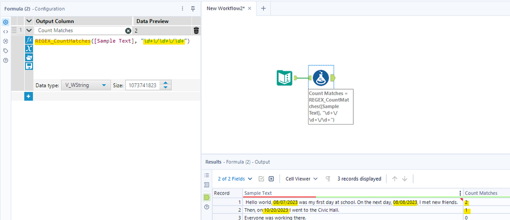 I drag the Formula tool to connect with the Text Input tool. Then, I created a new column Count Matches. The expression would be REGEX_CountMatches([Sample Text], "\d+\/\d+\/\d+"). It means in the Sample Text column, count how many strings that match the expression \d+/\d+\d+. If it matches, the Count Matches column will count 1.