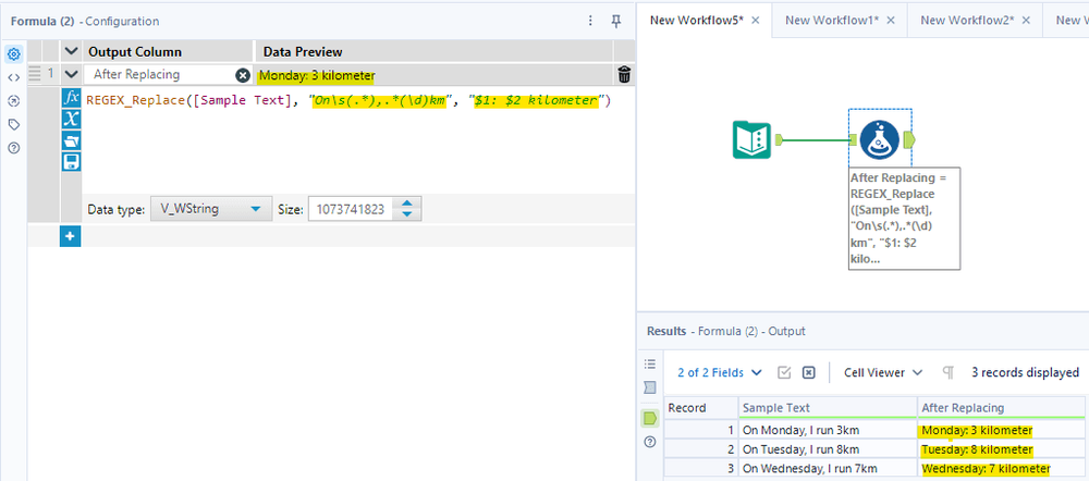 In this case, I use the REGEX_Replace function. I also use the Formula tool to connect with the Input Text tool. I type REGEX_Replace([Sample Text], "On\s(.*),.*(\d)km", "$1: $2 kilometer"). It means in the Sample Text column if the string text matches the pattern "On\s(.*),.*(\d)km", then I would like to change the format to "$1: $2 kilometer", whereas: