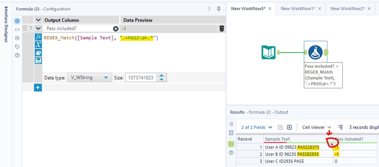 In this case, I will use the REGEX_Match() function to check each row. I use the Formula tool to connect with the Text Input tool. I created a new column Pass included?. Then, type REGEX_Match([Sample Text], ".+PASS\d+.*"). It means to check the pattern .+PASS\d+.* exists in the Sample Text in each row and returns True (-1) or False (0) whereas: